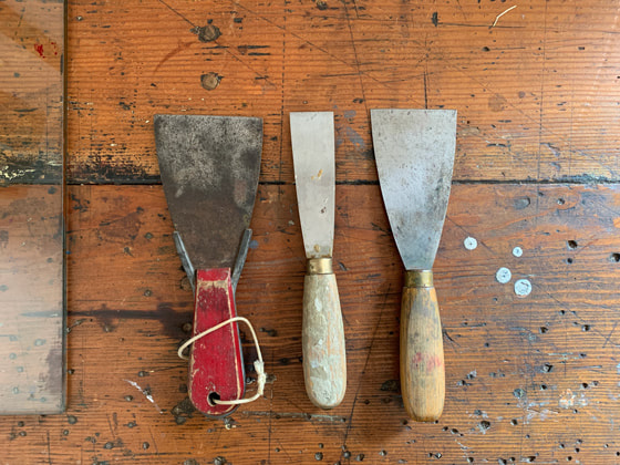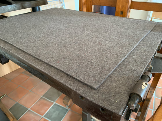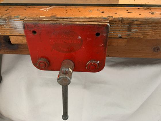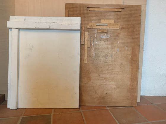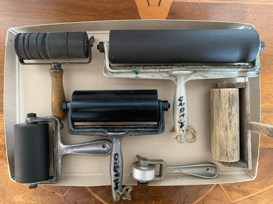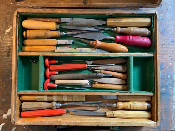 Die Druckwerkstatt verfügt aktuell über: eine Kniehebelpresse für Drucke von max. ca. 50 x 70 cm (Grösse Pressplatte: 55 x 75 cm), zwei Glasplatten zum Ausstreichen der Farben (965 x 52 x 5 mm und 295 x 245 x 6 mm), mehrere Farbspachtel, zwei Filzmatten (5 mm dick, Grösse 1 x wie Druckplatte und 1 x wie Schlitten), drei Farbwalzen (25, 15 und 10 cm), drei weitere Farbwalzen experimentell, Schnitzunterlage mit Anstössen für Holz- und Linolschnitt (49 x 60 cm), markierte Holzunterlagen (ca. 43 x 56 cm) zum Einpassen des Druckstocks auf der Presse, Holzschnittwerkzeug, Schleifstein (zur Anwendung mit Petroleum), zwei handbetriebene Schleifscheibengeräte, einige Bretter zum Holzschneiden, etwas Büttenpapiere, Schneidematte, Cutter, Metalllineale, Metallwinkel, Hochdruckfarben auf Ölbasis inkl. schwarz und transparent expander, Terpentinöl, Terpentinersatz, Petroleum, eine Kiste mit Lumpen, und Altpapieren, ABIG Handabreiber (55 mm), Werkbank mit zwei Schraubstöcken und eine allgemeine, gut sortierte Werkzeugkiste.