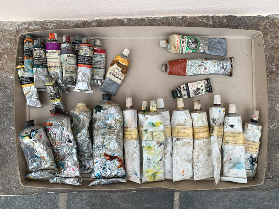 Zum Malen stehen ausserdem drei Staffeleien zur Verfügung: eine grosse auf Rollen, eine kleinere zum Aufstellen und eine mobile, klein zusammenklappbare für unterwegs. Es gibt ein beschränktes Sortiment an Acryl-, Wasser- und Plakatfarben.